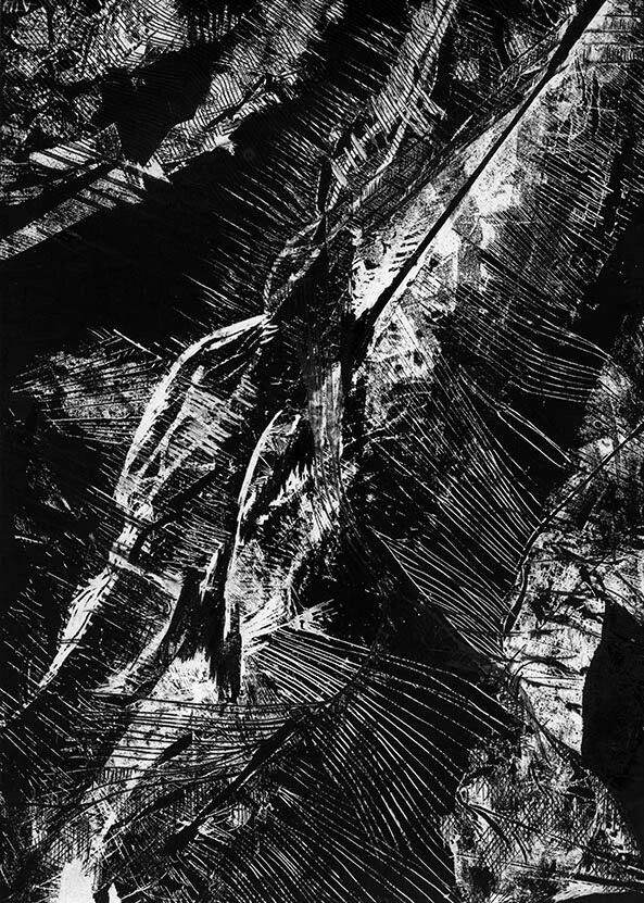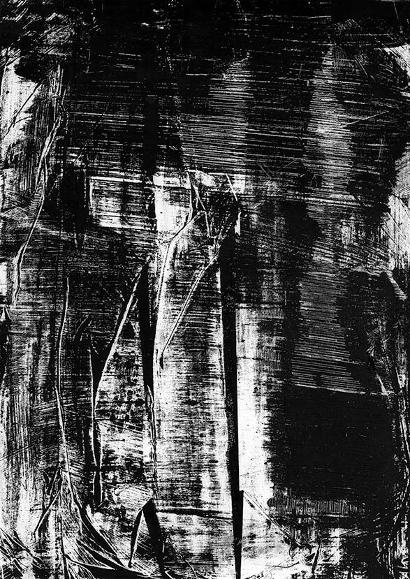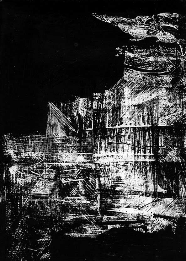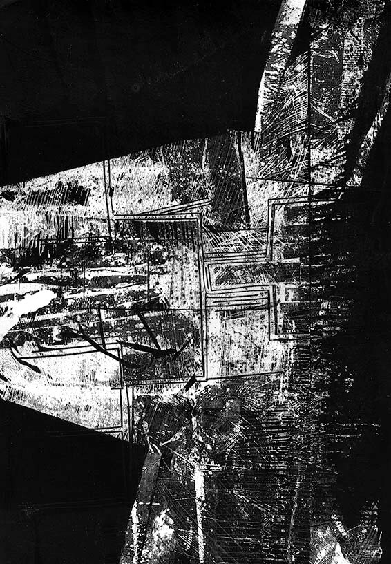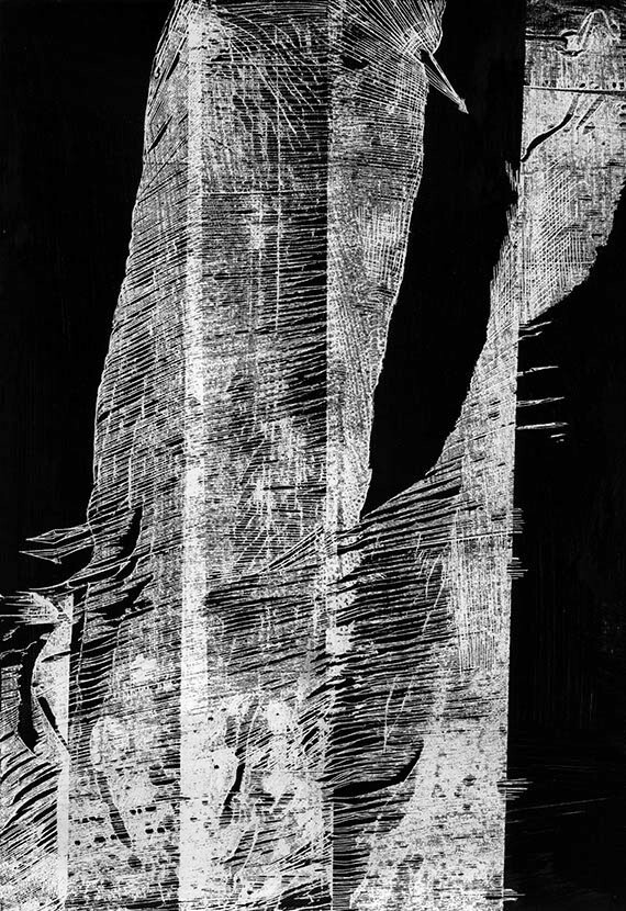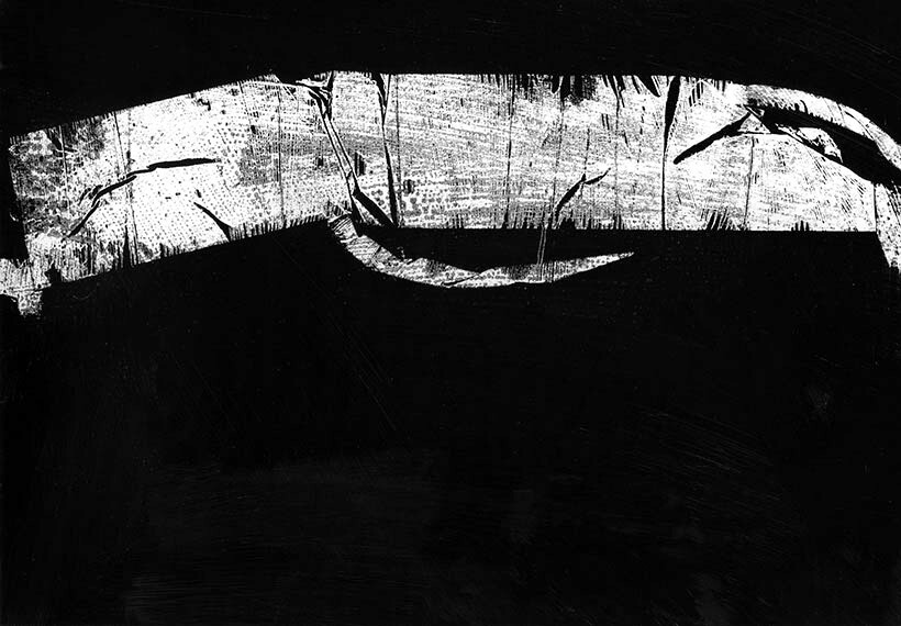 White Drift versammelt Arbeiten, in denen Landschaft nicht dargestellt, sondern freigelegt wird. Aus einer dunklen Tuscheoberfläche entstehen weiße Linien, Flächen und Brüche – Spuren von Kräften, Schichtungen und Übergängen. Horizontales und Vertikales, Verdichtung und Auflösung stehen in einem dynamischen Gleichgewicht.